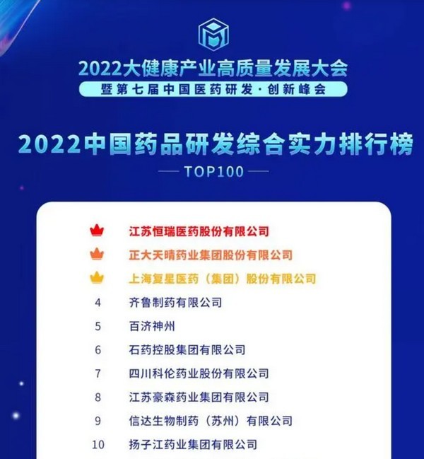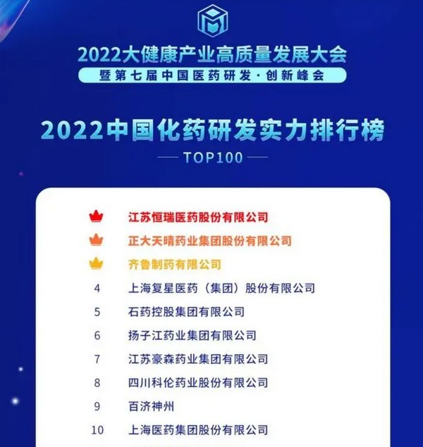 近日,2022大健康产业高质量发展大会暨第七届中国医药研发•创新峰会启幕。会上,“2022中国药品研发实力排行榜”系列榜单隆重发布,正大天晴药业集团荣登“中国药品研发综合实力排行榜TOP100”第2位、“中国化药研发实力排行榜TOP100”第2位、“中国生物药研发实力排行榜TOP50”第6位。