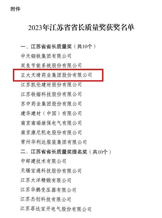 近日,2023年度江苏省省长质量奖正式揭晓。根据《江苏省省长质量奖管理办法》等规定,江苏省人民政府决定授予正大天晴药业集团等10家单位2023年江苏省省长质量奖。